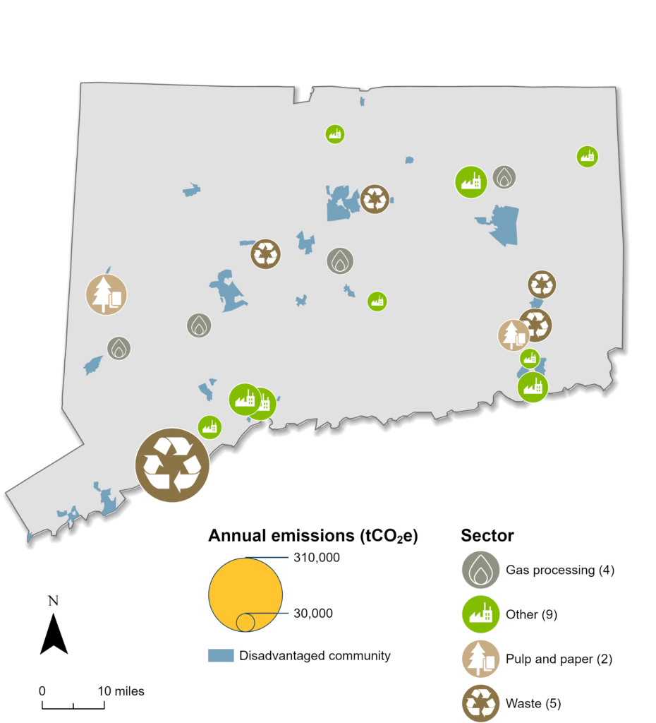 Waste and petroleum and natural gas systems are the highest-emitting sectors in Connecticut. Universities and machine manufacturing are also significant sources of emissions. Industrial facilities are located throughout southern and central Connecticut. Approximately half of the state’s industrial facilities are in the Hartford and New London areas.