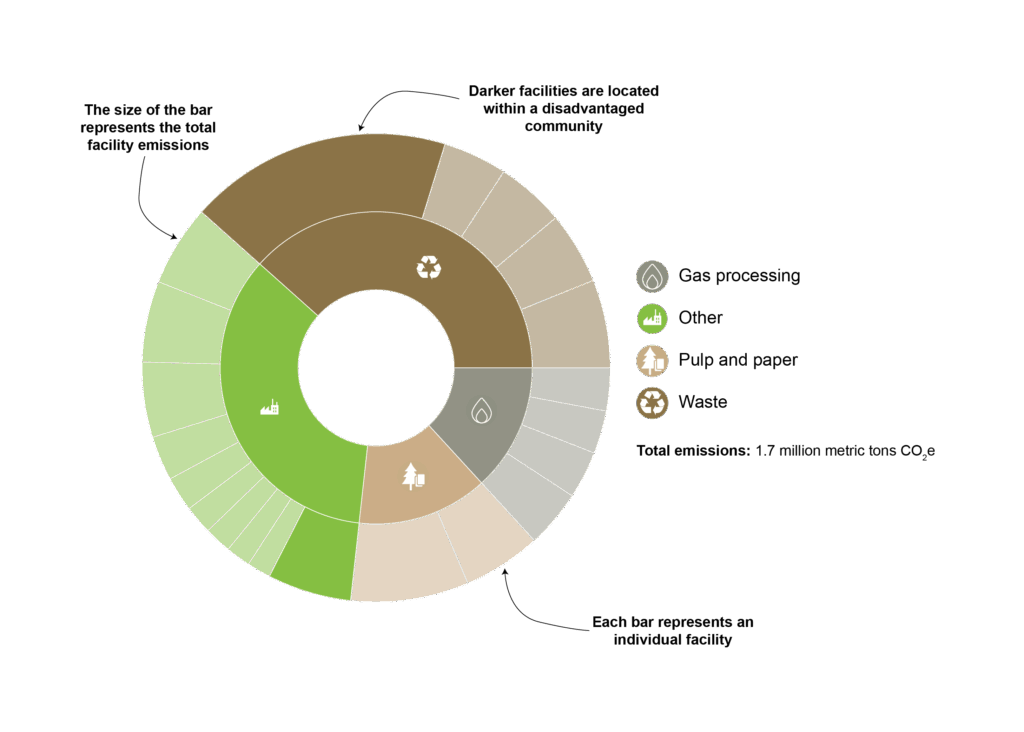 - The outer circle also indicates the share of a sector’s emissions generated in disadvantaged communities.