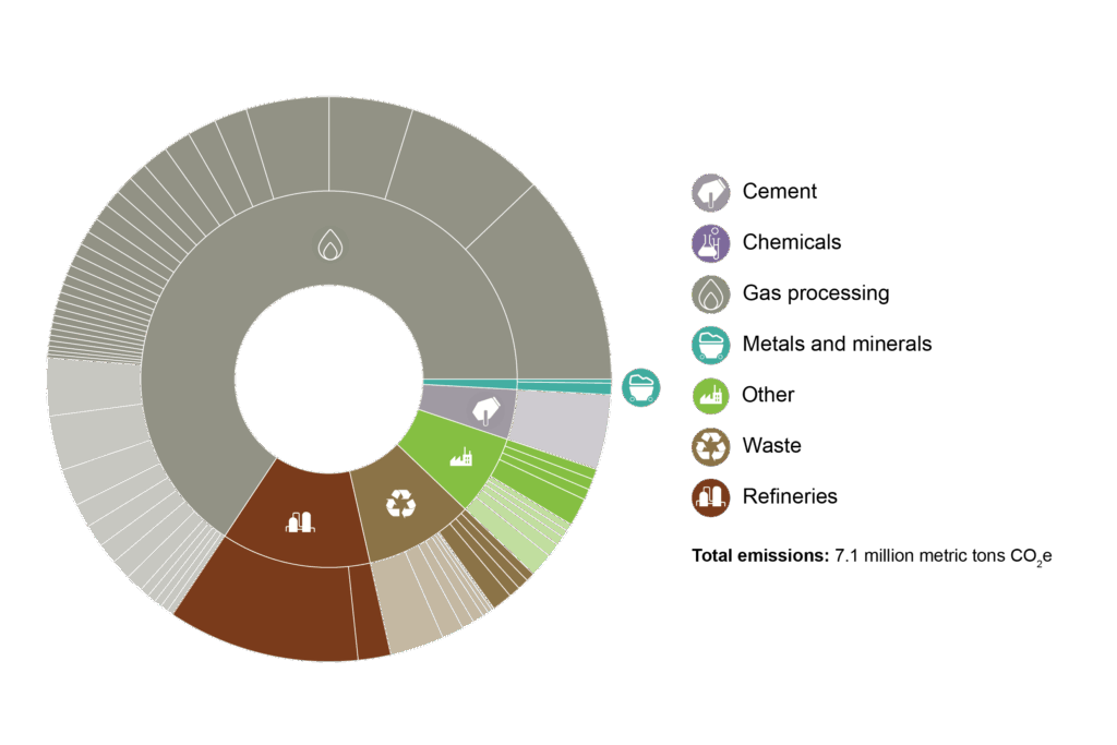 - The inner circle provides a visual representation of the share of emissions generated by each industrial sector.
