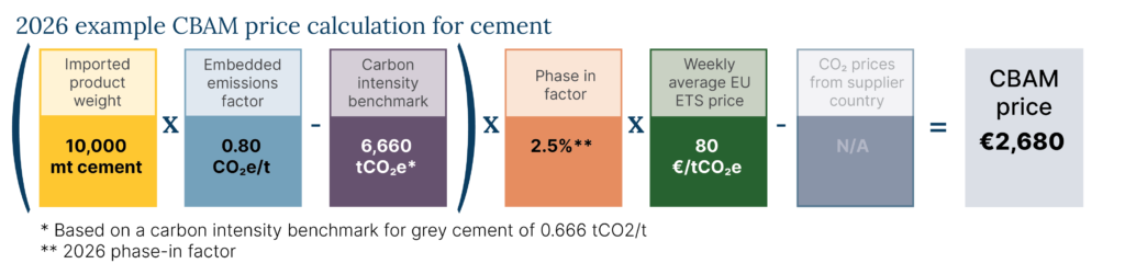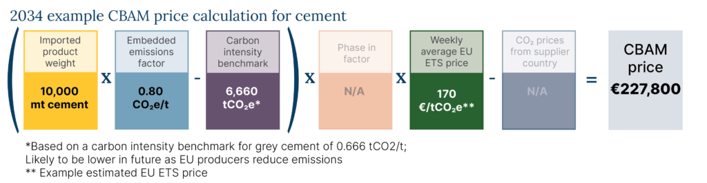 An example of a CBAM calculation based on a carbon-intensity benchmark for Portland cement (grey cement) of 0.666 tons of carbon dioxide per ton of cement (tCO2/t) is shown below for 2026 and 2034. The EU CBAM price formula includes a deduction for importing jurisdictions with their own carbon price. This box is grayed out in the 2026 and 2034 examples below to reflect current US policy conditions.