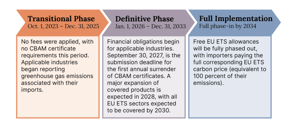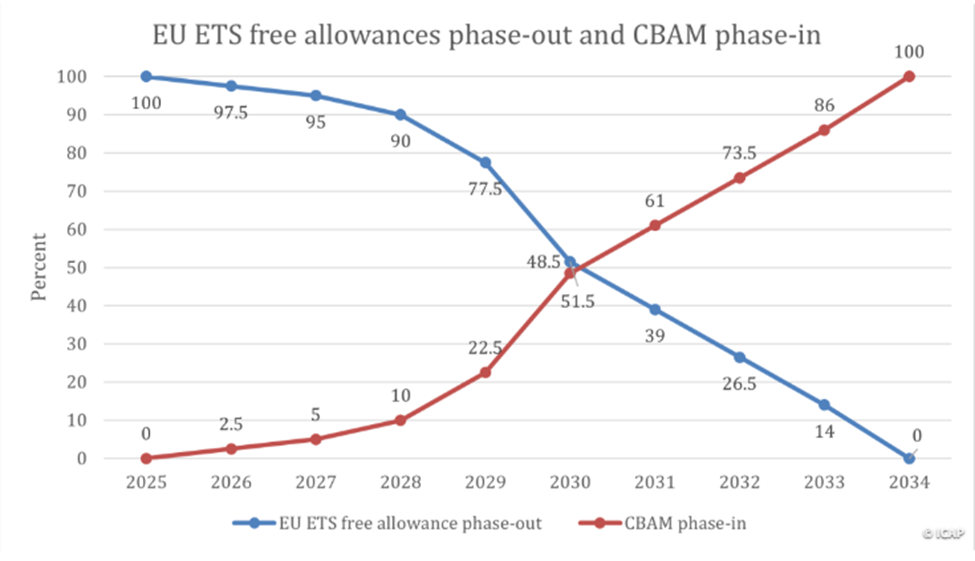 As a carbon pricing tool, EU CBAM complements the EU ETS cap-and-trade system by ensuring that both domestic and imported goods are subject to an equivalent carbon price. Similarly, the phase-in of EU CBAM between 2026 and 2034 complements the phase-out of existing free allowances under the EU ETS. By 2034, CBAM will replace the protection that certain domestic EU sectors currently receive through free ETS allowances.